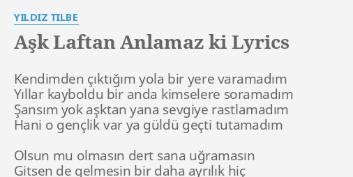 Aşk laftan anlamaz ki sözleri. Kendimden çıktım yola bir yere varamadım yıllar kayboldu bir anda kimselere soramadım şansım yok aşktan yana sevgiye rastlamadım. Kendimden çıktım yola bir yere varamadım yıllar kayboldu bir anda kimselere soramadım. 50 videos play all mix yıldız tilbe aşk laftan anlamazki youtube. Aşk laftan anlamaz ki şarkısının sözleri nasıl diye merak mı ediyorsunuz.