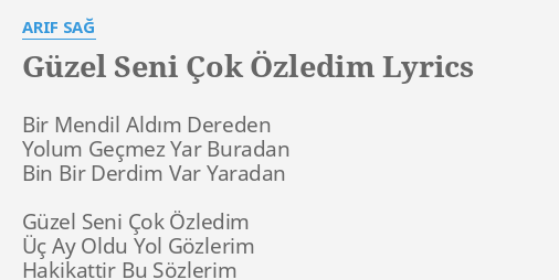 üç ay oldu yar gözlerim. Hani bir insanın en yakın arkadaşı vardır ya her şeyi paylaştığı ama uzakta olan nadir görüştüğü ben onu çok özledim ve galiba kaybetmek üzereyim. Bir mendil aldım dereden. Arif sağ şarkıcısının popüler şarkılarından güzel seni çok özledim şarkısının sözlerini sizlerle paylaşıyoruz.